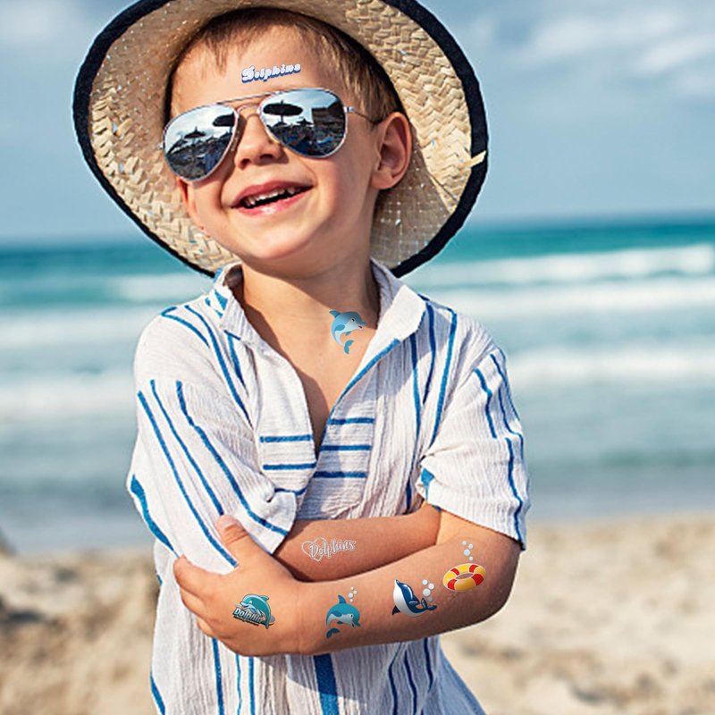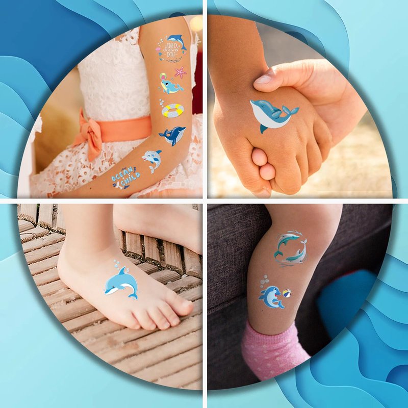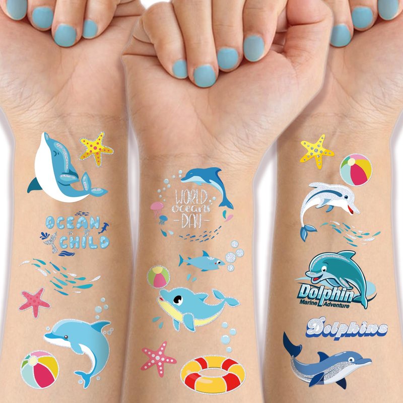 - 🐬Kids Party Supplies - 4 sheets glitter dolphin styles temporary tattoos for kids include various dolphin shape, starfish,fish. Cute dolphin tattoos stickers for kids can meet different occasions parties, such as dolphin party supplies, party decorations, birthday gifts for girls, halloween party, christmas party, etc. Cartoon cute ocean tattoos, let children learn more about marine life, and at the same time let children experience the fun of tattooing!