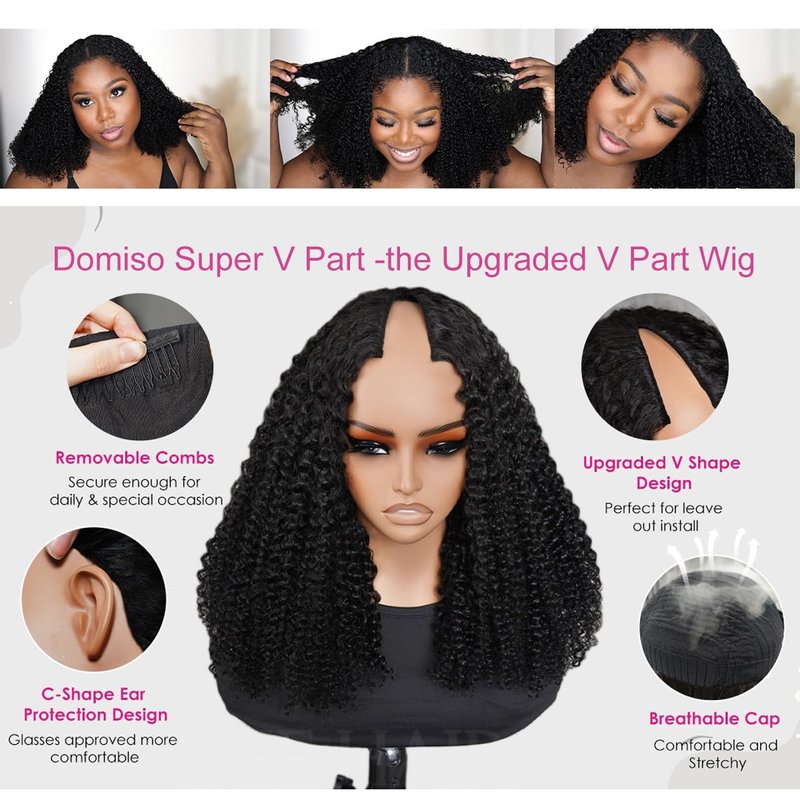 Domiso Afro Kinky Curly New Super V Part Wig Human Hair Glueless Wigs Pre-Minimum Leave Out 200% Density Upgraded V Part Wigs with Anti Slip Elastic Band and Removable Clips for Secure 20 Inch
