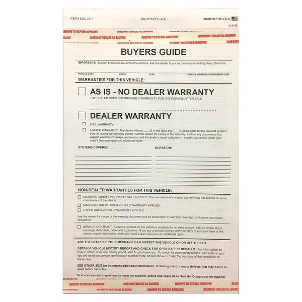Revolutionize Your Dealership With Our 2-Part Buyers Guide Form - The vehicle buying process can often be a complicated affair. Our Vehicle Warranty Information Form is designed to simplify the process, ensuring a smooth and hassle-free experience for both the buyer and the seller. These forms serve as a comprehensive document, covering all necessary information regarding the car warranty, thus fostering a trustful relationship between the dealer and the customer. Our Auto Dealership Form stands out due to its carefully considered dimensions of 7.33 x 11.75 inches. The size allows it to fit perfectly into any workflow, ensuring that it does not disrupt your daily operations. It is printed in bold, black ink, ensuring the text is clear, legible, and difficult to alter. This eliminates any room for misunderstandings or discrepancies. Standard buyers guide text is on the back. The Car Warranty Form is designed with convenience in mind. It features adhesive tape at the top and bottom, allowing it to be securely attached to the inside of a vehicle window. It is also 2-part carbonless, meaning it provides clean and clear copies, eliminating the need for manual entries and reducing the risk of errors. One of the standout features of our Automotive Sales Document is the detailed content. The main text area features 'As Is - No Dealer Warranty / Dealer Warranty,' offering complete transparency and protection for all parties involved. It also includes lines for additional warranty text and Non-Dealer Warranties, catering to all potential scenarios. Last but not least, the Used Car Warranty Form comes in packs of 100, offering optimal convenience and easy storage. This makes it ideal for busy dealerships that handle a high volume of transactions. In addition, it is compatible with Form # BG-2017-2PT-AI-E, ensuring consistency across your documents.