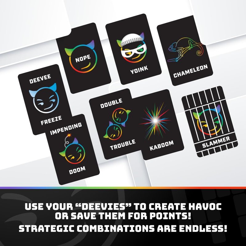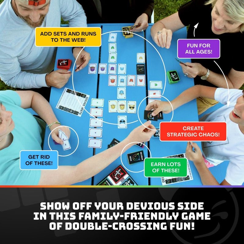 Don't Cross Me is a simple, playfully devious card game of connected sets and runs. In this game, players take turns building strategically connected sets and runs on the table. As the board grows, the game looks similar to Dominoes, Scrabble or Bananagrams — but with a clever twist! You see, each new set or run added to the growing pattern is called a "Cross". Crosses earn you special cards from the Devious Deck that can be used to wreak havoc, or save for points! Successfully playing a round-ending card from the Devious Deck, or going a full turn without any cards in your hand, ends the round! It's that simple. (P.S. we threw in the Blood Feud Expansion for free, in case you really want to cause a ruckus!)