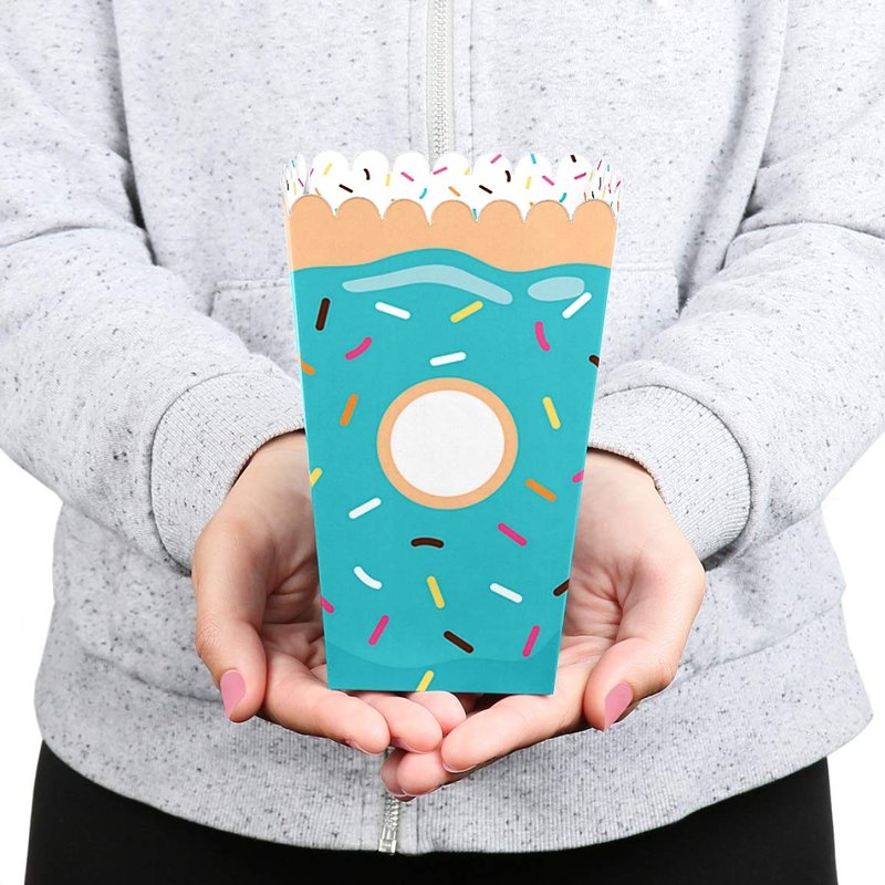 - Donut Worry, Let’s Party favor popcorn treat boxes SIZE 5.75 inches tall x 3.5 inches square at the top. The unique design and large size makes these 12 popcorn boxes a must-have for any baby, bridal shower or birthday party.