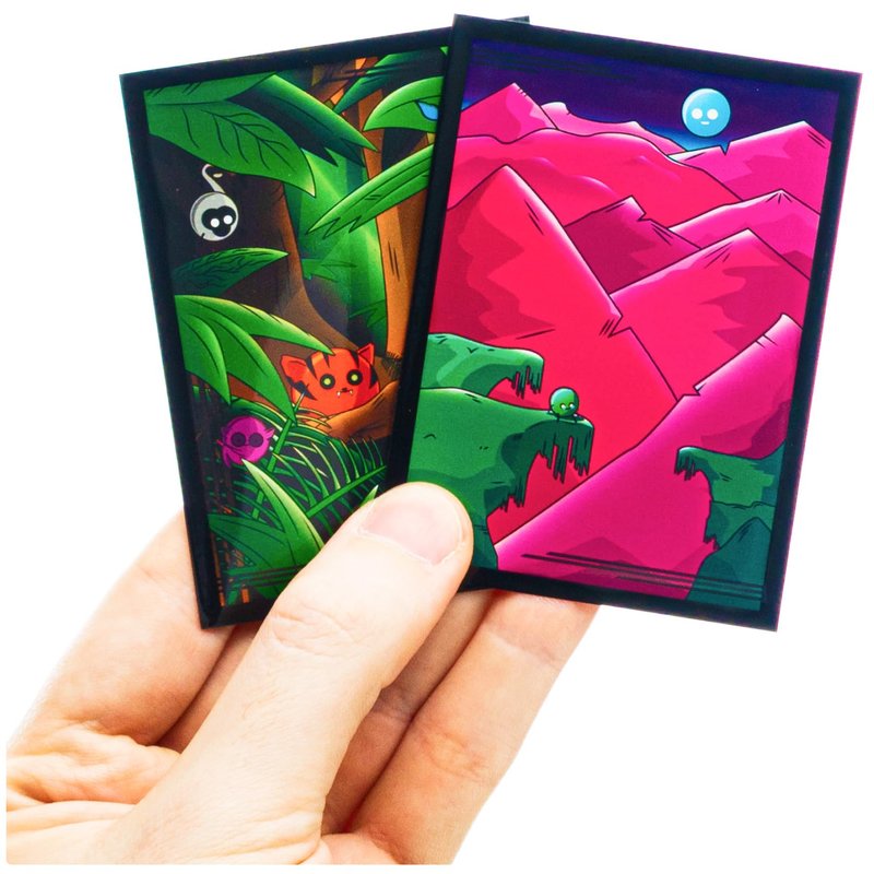 Introducing Doomsleeves - the ultimate accessory for your Doomlings card game! With 300 ultra-soft and anti-slip card sleeves to protect your cards from the end of the world! (Or at least food and beverages) Designed with artwork by Justus Meyer and mirrored silver interiors, these sleeves add a touch of elegance to your Doomlings card collection, giving each card the appearance of being inside a picture frame. The green jungle back for the Trait cards and the pink moonlit landscape for the Ages makes each pack a visual delight. Each pack comes with 195 Trait sleeves, 55 Age sleeves, and 50 clear sleeves for cards that require both sides to be visible for play, including Player Aids, Gene Pools, Birth of Life, and Meaning of Life. Does not cover Overlush cards