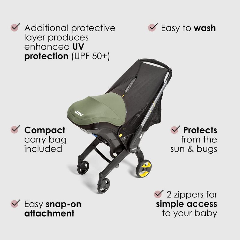 Up your babys sun and insect protection with the Doona 360 Protection accessory. This accessory allows you to add UV protection to your Doona Infant Car Seat without limiting accesss to baby. Please note that this listing is for the 360 Protection accessory only - Doona Infant Car Seat with Base sold separately. Features: