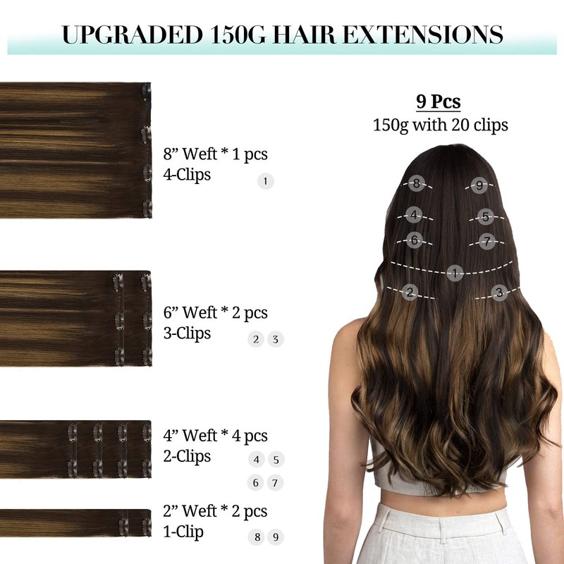 - 【150g Upgrade Hair Extensions Weight -- Super Thick for Thin Hair】-- 9 pieces 150g with 20 clips per set. 132g net weight without clips, 150g with clips. On the basis of the original 120g, the upgraded version of the clip in hair extensions has added 2 pieces of 2-clip weft. Don't worry about your hair being too thin and need to buy two packs, 1 pack of 150g hair extensions can meet your needs. If you still feel that it is not enough, we also have 70g clip in hair extensions to supplement.