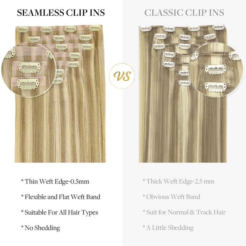 - 【5-10 Minutes to Install -- Easy & Fast Create a Full Hairstyle Look Anytime】-- Seamless clip in hair extensions is an easy and quick tool for adding volume and length. It only takes 5-10 minutes to put on and 3-5 minutes to remove. Compared with classic double weft clip hair, seamless clip in hair extensions is more suitable for people with thin hair. Please combine the wearing and styling tips recommended on our page for perfect color match and styling.