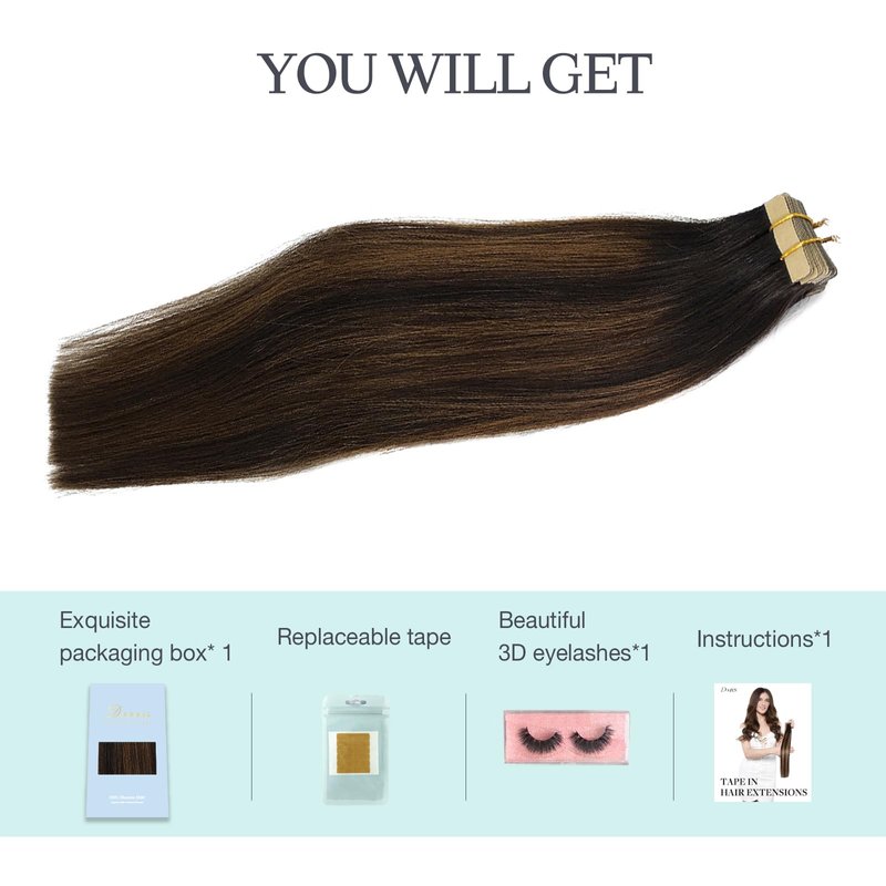DOORES tape in human hair extensions Brand purpose: Design fashionable and high-quality hair for women and girls, let them have beautiful hair, and maintain a good mood every day Product description 1. Hair extensions type: Seamless tape in human hair extensions. 2. Hair material: 100% remy human hair without any mixed. 3. Hair set: 2.5g per piece, 50g per package. 1.5”width double sided tape. We recommend 1-2 packs for thick hair, 2-3 packs for thin hair. 4. Hair length: 14inch, 16inch, 18inch, 20inch, 22inch, available. 5. Texture: Straight, can be curled as you like. 6. Tape size: 1cm×4cm. 7.Suitable for any occasion: Whether it is daily life or party, wedding, Christmas, etc., it is also a good gift for your female friends 8. Hair color: warm gorgeous fading matched your hair color perfectly, ombre or highlighted for you to choose. Hair care method 1. Wash your hair by hold gently, do not rub your hair. Everyday wash is not good for your extensions, especially when you first apply the hair. 2. Never use any products containing alcohol or ethanol which can damage the hair extensions and also wear down on the adhesive. Use sulfate free conditioner as well as 100% natural hair products to wash and keep hair extensions in good condition. 3. Comb from the underside to the root of the hair. Comb your hair with a wide-tooth comb to avoid knottin. 4. Sleep with a silk cap or buy a silk pillowcase will protect the hair. 5. Beat the hair with a towel until the hair is dry, it is best to dry naturally.