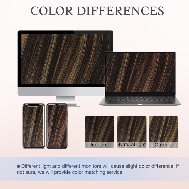 - [Color Differences & Color Match Service] The most popular different colors available, giving you more options, which can perfectly blend with your own hair. The actual color may have slight difference due to monitors or light, if you have difficulties in choosing, feel free to get in touch with us. Since your own hair will cover the extension after wearing, the mixed effect will not be obvious. If you want mixed color, a curly style will blend more perfectly!