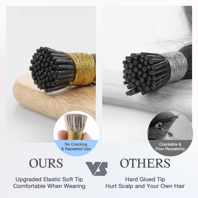 - [Upgraded Italian Keratin Glue--with Higher Elasticity & Softness] Upgraded Italian keratin glue is used on bonded ends. It is pure natural, no cracking and with higher elasticity. Compared with other's hard glue tip, the upgraded one greatly reduces the pulling and foreign body feeling while wearing and sleeping, providing you with a quality wearing and sleeping experience. It is also more reusable than other hair extensions with hard glue tip.