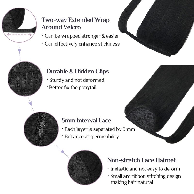 - 【Double security -- Non-stretch Lace Hairnet & Hidden Clips】The hair net is sewn with ribbon around it, it is inelastic and not easy to deform. And a clip specially used for fixing inside the hair curtain, as long as it is pinned in the hair, it can ensure that the pony tail will not fall off. And this clip will not hurt your scalp at all, so it is very comfortable. In addition, we also include a black clip and head rope to better fix the ponytail.