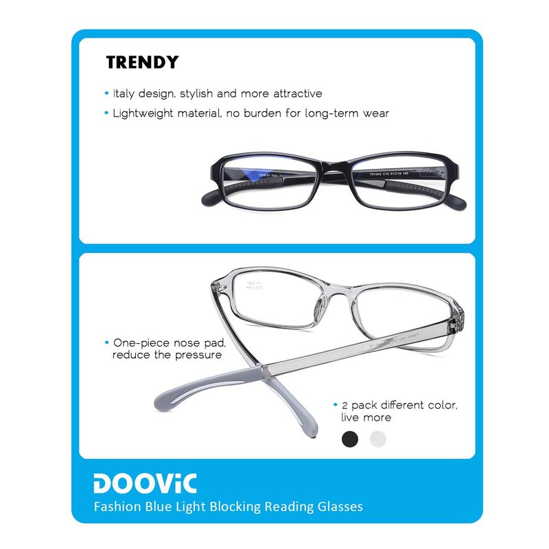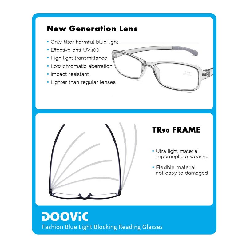 - 【PREMIUM LENSES】- DOOViC readers use professional premium blue light blocking lenses. Explosion-proof, High Definition, Restore true colors and Durable. Bring you a better vision.