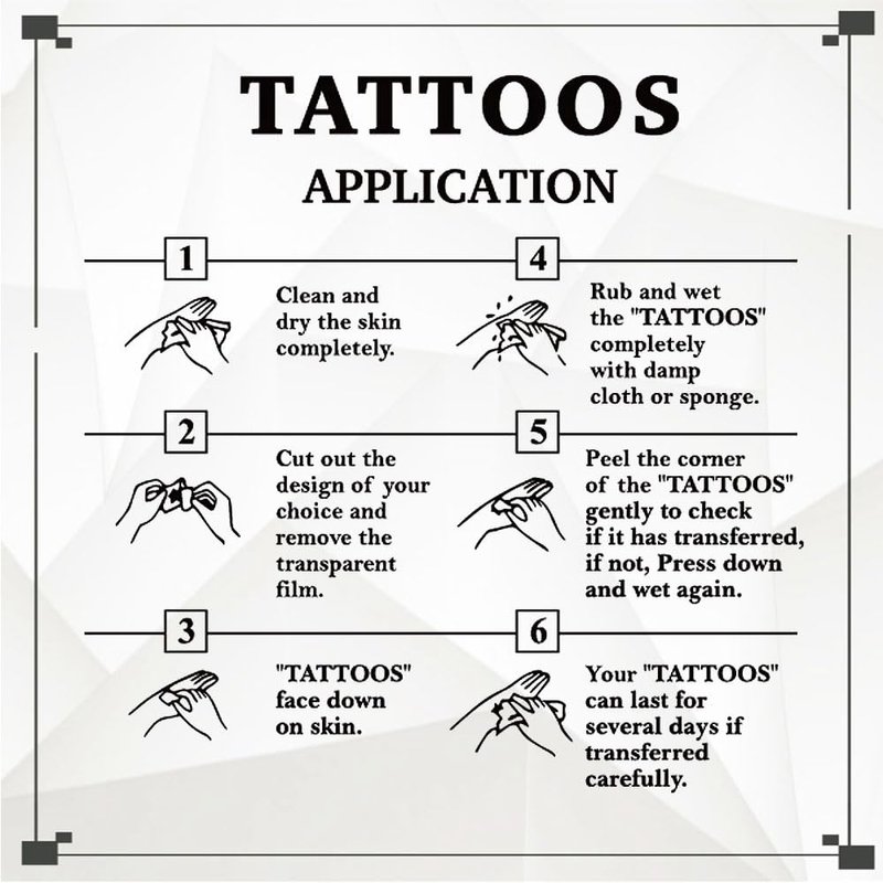 - Easy To Use And Remove:Remove the transparent film on the tattoo paper,stick the tattoo on the clean and dry skin,wet the tattoo with water,remove the paper,and let the tattoo dry.It can be easily removed by rubbing alcohol, body oil and olive oil.