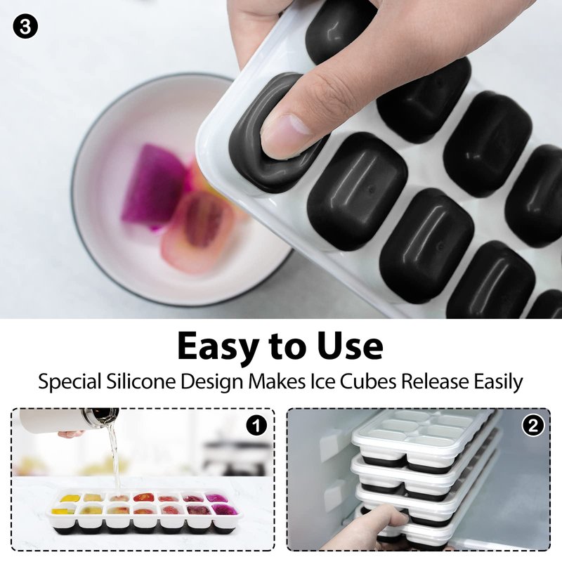 DOQAUS Ice Cube Trays 4 Pack, Easy-Release Silicone & Flexible 14-Ice Cube Trays with Spill-Resistant Removable Lid, Stackable Ice Trays with Covers (Night Black)