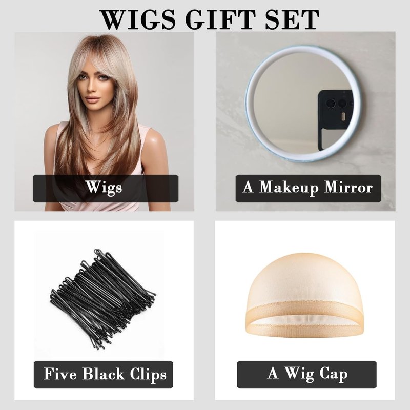 - 【Exquisite Wigs for Women Gifts】👩A medium length ombre dark brown blonde straight wig with bangs(Wigs size:21.6inches).🎁1 pcs HD wig cap.😀A small make-up mirror.👄Five small black clips.