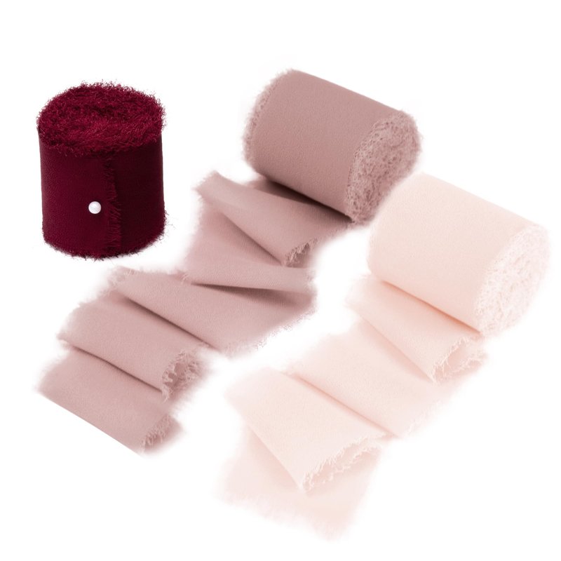 - Size and color: 2" wide x 7 yard long per roll, with 2" width, it would be the right ribbon for gift wrapping most of time. Simple box adding frayed edge ribbon makes the gift more rich and colorful. The set contains: Burgundy, Mauve and Pink ribbons, 1 roll of each. Beautiful, vibrant colors add to the rustic aesthetic.
