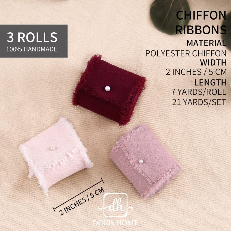 DORIS HOME 3 Rolls 2"x7Yd Fringe Chiffon Ribbon for Flower Bouquet, Handmade Burgundy & Pink Ribbon for Gift Wrapping, Frayed Edge Ribbon for Crafts, Decorating, Bouquet Wrap, Wedding Invitation