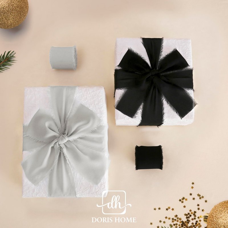 - Size and color: 2" wide x 7 yard long per roll, with 2" width, it would be the right ribbon for gift wrapping most of time. Simple box adding frayed edge ribbon makes the gift more rich and colorful. The set contains: White, Light Gray and Black ribbons, 1 roll of each. Beautiful, vibrant colors add to the rustic aesthetic.