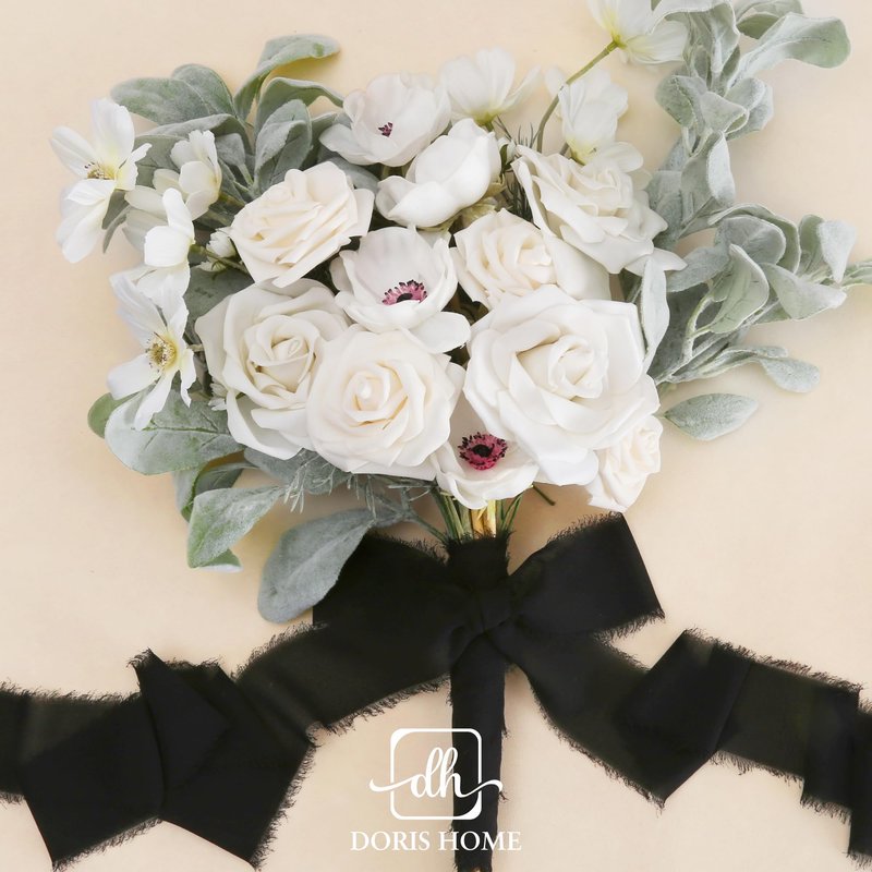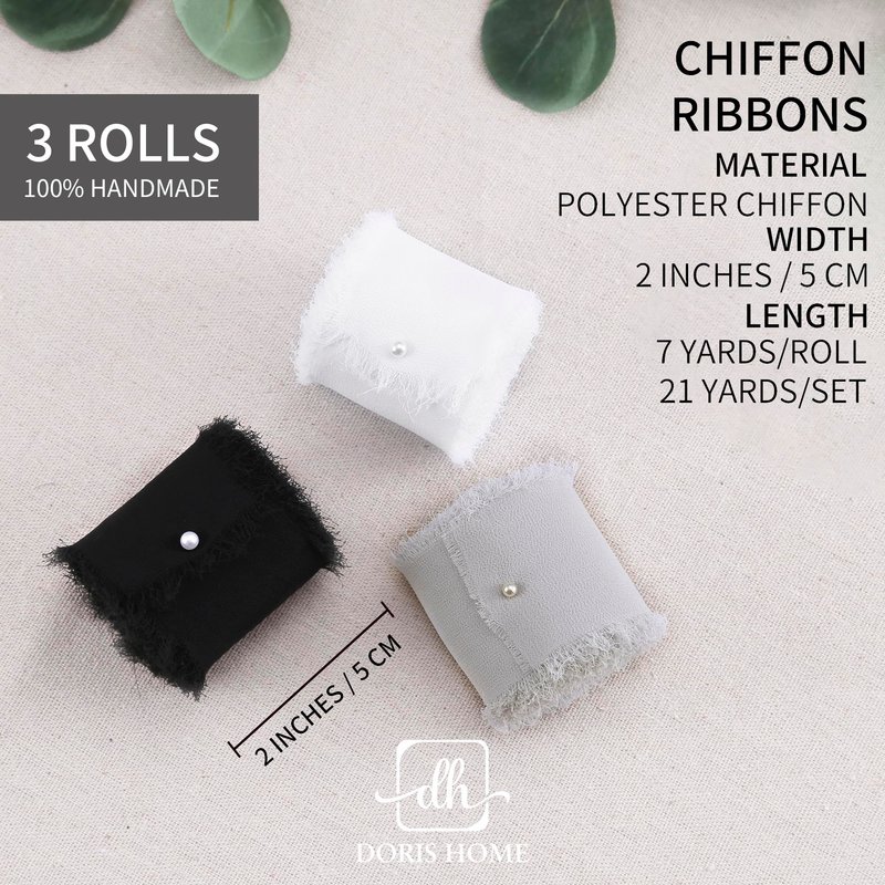 DORIS HOME 3 Rolls 2"x7Yd Fringe Chiffon Ribbon for Flower Bouquet, Handmade White & Black Ribbon for Gift Wrapping, Frayed Edge Ribbon for Crafts, Decorating, Bouquet Wrap, Wedding Invitation