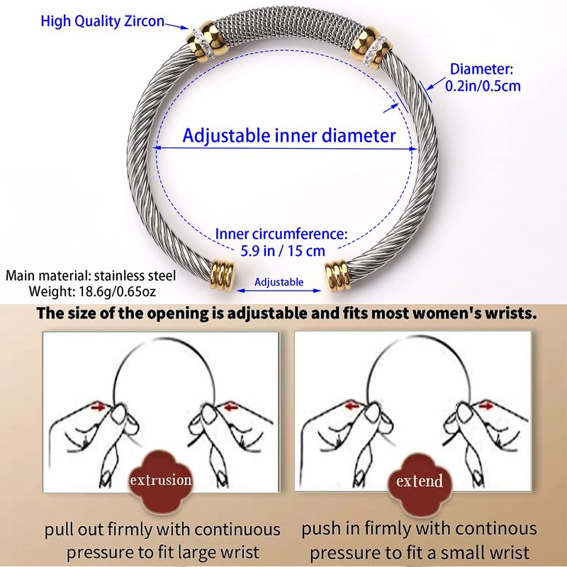- size & Adjustable:total length: 5.9in (15cm), width: 0.2 inch (5mm).The cable Cuff bracelets being very lightweight and flexible.The inner diameter can be stretched and adjusted to fit most wrists.If the wrist size is different, just pull or squeeze the bracelets to adjust.Please refer to the picture size before ordering.