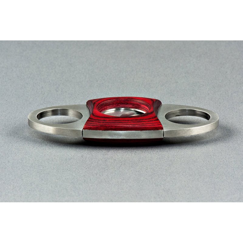 DOS CABALLOS CIGARS RED WOOD VEE HANDLE STAINLESS STEEL CIGAR CUTTER WITH SELF SHARPENING BLADES.