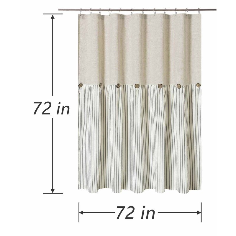 - Soft, linen and cotton blend fabric curtain with a farm house,shabby chic or country style design for your bathroom. Beige and Grey stripe shower curtain with pleats and wooden button embellishments to enhance your space.