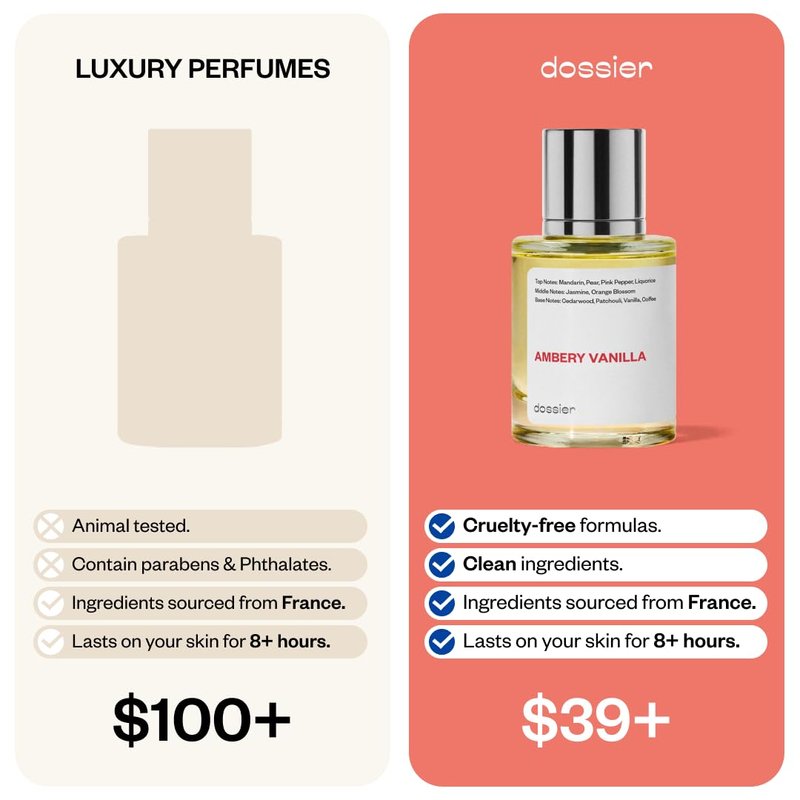 Introducing our captivating fragrance, Pure Fragrance Ambery Vanilla. Immerse yourself in the captivating blend of Mandarin, Pear, Pink Pepper, and Liquorice in the top note, as these captivating first notes awaken your senses and create an irresistible introduction to the scent. As you delve into the middle note, discover the heart of the perfume, where Jasmine and Orange Blossom intertwine to create a floral symphony. This exquisite combination evokes a sense of elegance and sophistication, captivating those around you with its alluring charm. In the base note, indulge in the irresistible embrace of Cedarwood, Patchouli, Vanilla, and Coffee. These notes create a warm and sensual trail that lingers on the skin, leaving a lasting impression and enveloping you in their comforting and intoxicating essence. Inspired by YSL's Black Opium, our perfume captures the essence of its enchanting and seductive allure. It goes beyond being a mere scent; it's an immersive experience that transports you to a world of mystery and sensuality. Crafted with the finest French ingredients sourced from Grasse, the perfume capital of the world, our eau de parfum reflects the highest standards and values. Our perfumers bring their expertise, using higher concentrations to ensure an exceptional olfactory experience. You can't have Dossier without that authentic French touch! At Dossier, we believe that high-quality fragrances should be accessible to everyone, not just a select few. Our goal is to promote equality by providing premium eau de toilette at affordable prices, allowing everyone to experience the luxury of exquisite scents. Our commitment to sustainability and ethical practices is reflected in our vegan and paraben-free formula. Following cosmetic safety recommendations, our perfumes are formulated with sustainable and highest quality ingredients, free from phthalates. Our fragrance is 100% non-toxic, cruelty-free, and eco-friendly, allowing you to indulge guilt-free.