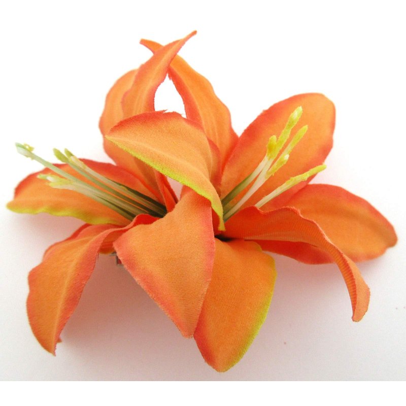 Double orange lily silk flowers hair clip each attached to a 1.75 inch rectangle alligator clip with teeth for extra hold. Perfect finishing touch to a pin up or updo, headband or beanie....clip to your favorite scarf or hat! Cluster a few together for a larger flower look & bridal.