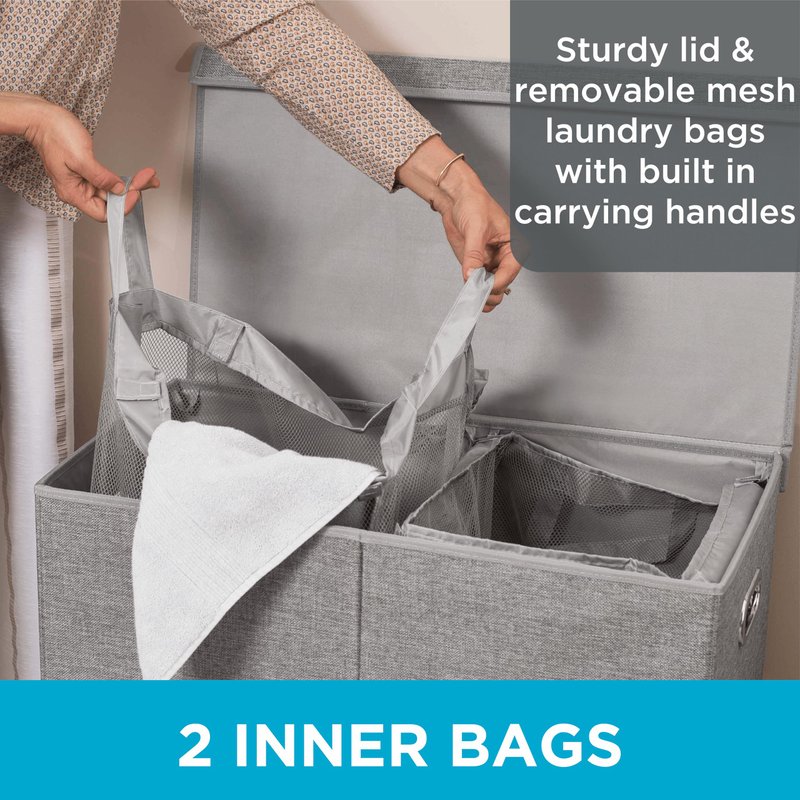 Double Laundry Hamper with Lid | Removable mesh bags | Dual Compartment Clothes Hamper | Grey