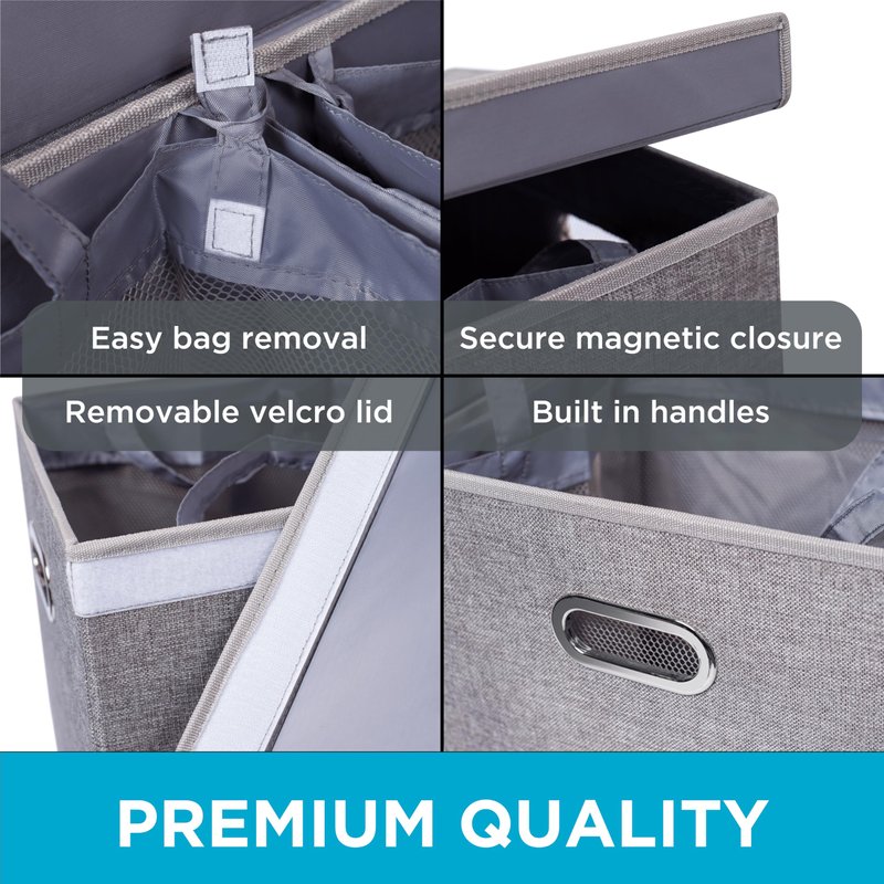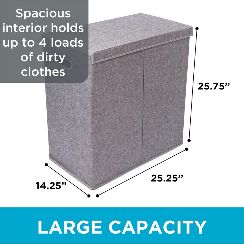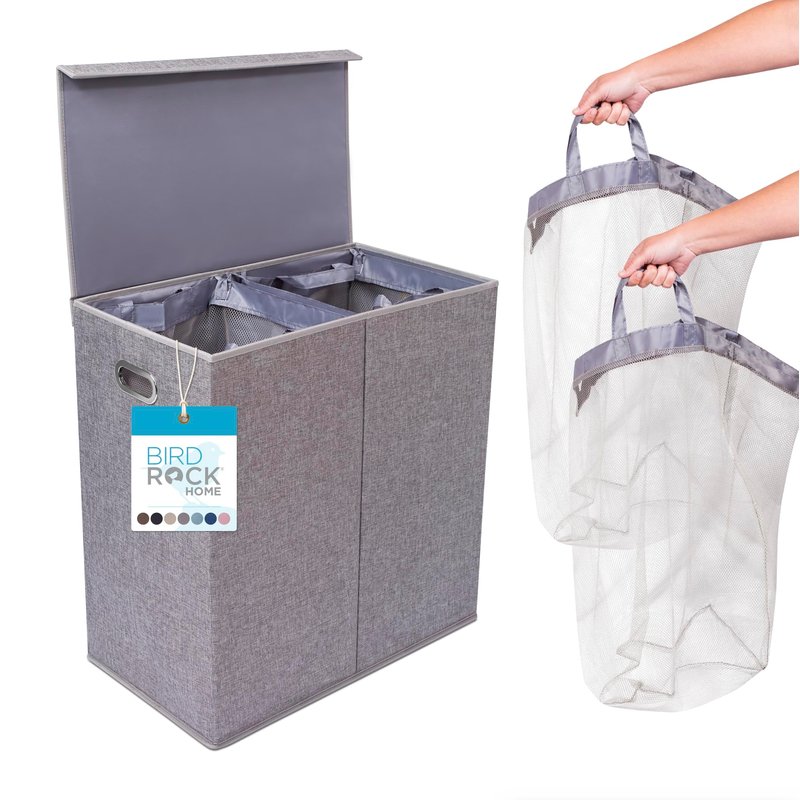 The BIRDROCK HOME Double Laundry Hamper with Lid and Removable Liners is a great addition to any bedroom, laundry room or bathroom. The double hamper features 2 removable liners, making it great for carrying your dirty laundry to the washing machine instead of dragging the whole hamper across your home. The removable liners are washable, keeping the hamper itself cleaner. The hamper lid keeps dirty clothes out of site while also concealing any smells. Constructed from polyester linen, the hamper offers you a durable yet lightweight solution to organizing your dirty clothes. The hamper can fit 4 standard sized loads of laundry. Our laundry hamper will help you keep your home organized without being a big eye sore. It helps keep dirty clothes off the floor by offering a single location for your dirty clothes. The double hamper allows you to sort clothes by color, spouse, or child, saving you time on laundry day.