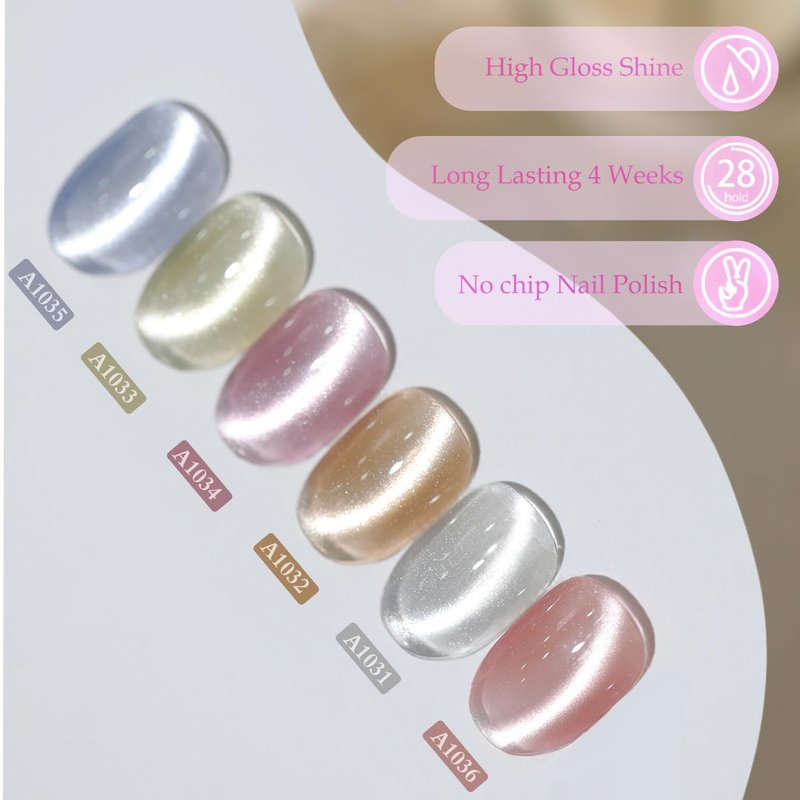 - Cat Eye Gel Nail Polish Set: Double Rhythm cat eye gel nail polish kit includes 6colors 7.5ml / 0.32 fl.oz gel nail polish. This cat eye gel nail polish set includes silver white orange green blue purple pink colors. Each kit comes with one magnetic tool for you to create a different cat eye style for your nails.