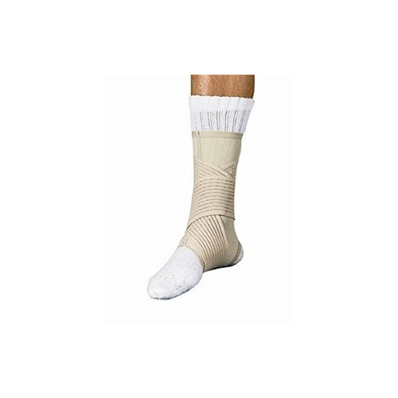 Beige four-way stretch Spandex, Double strap style offers compression to medial and lateral side of ankle, 3" wide segmented straps wrap in figure-eight, Wear over sock Fits either foot, Sizes: (Measure around ankle joint) Med 8 1/4 - 9-1/2 inches