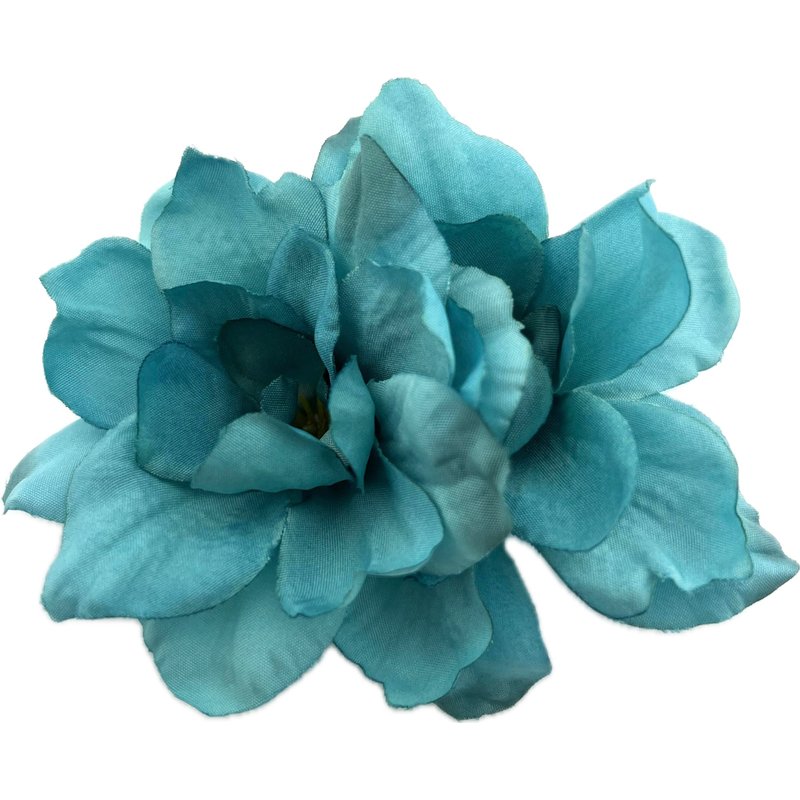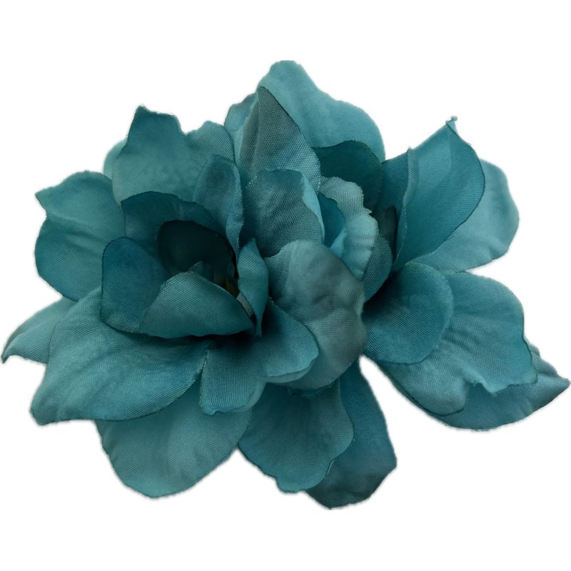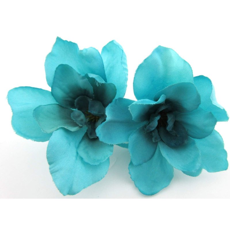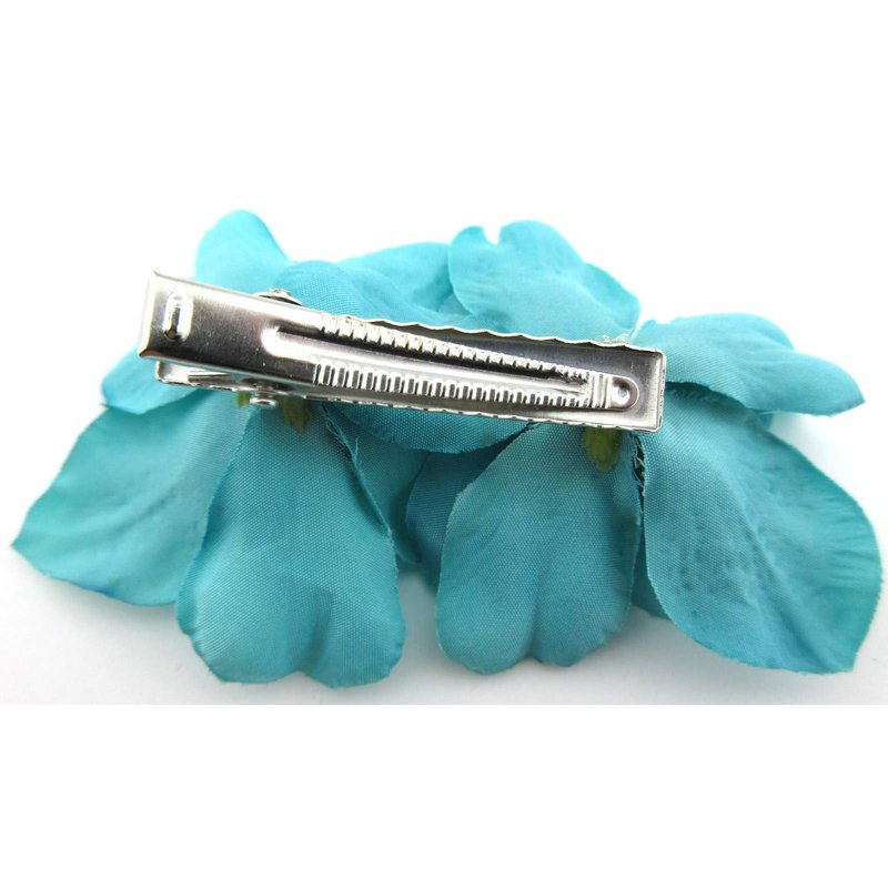 Double turquoise silk flower apple blossoms, each attached to a rectangle alligator clip with teeth for extra hold. Perfect finishing touch to a pin up or updo, headband or beanie....clip to your favorite scarf or hat! Cluster a few together for a larger flower look & bridal.