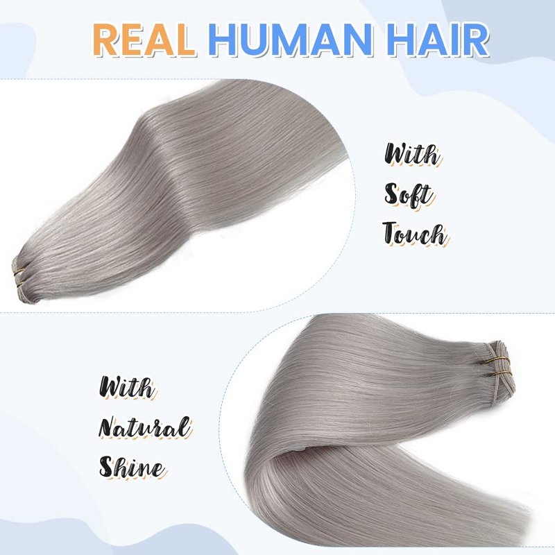 Double Weft Human Hair Extensions Silky Straight Silver Sew in Hair Bundles 18 Inch 100Gram Hand Tied Bundles Grey Real Human Hair Hand Tied Weft Hair Extensions Silver Remy Hair Bundles for Women