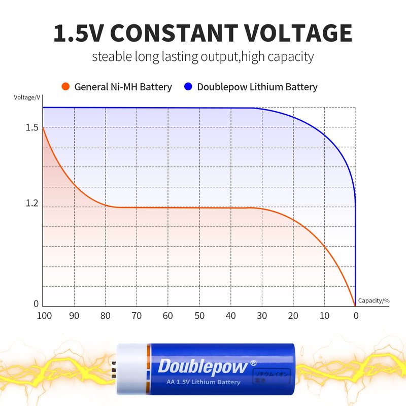 - High Capacity 3400mWh AA lithium battery:Upgraded doublepow aa rechargeable battery longer lasting compared with other same capacity batteries,perfect for household electrial device like wireless mouse, camera, electric toy, remote controlled toy, mouse, flashlight, bathroom scales, medical devices etc.