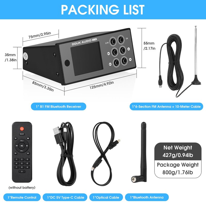 Douk Audio B1FM Bluetooth 5.1 Receiver DAC, HiFi Stereo Music Player with LDAC & aptX HD, Premium FM Radio, Optical & Coaxial Digital Outputs, 2.4” Display & Remote for Home Audio Systems