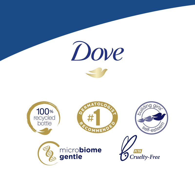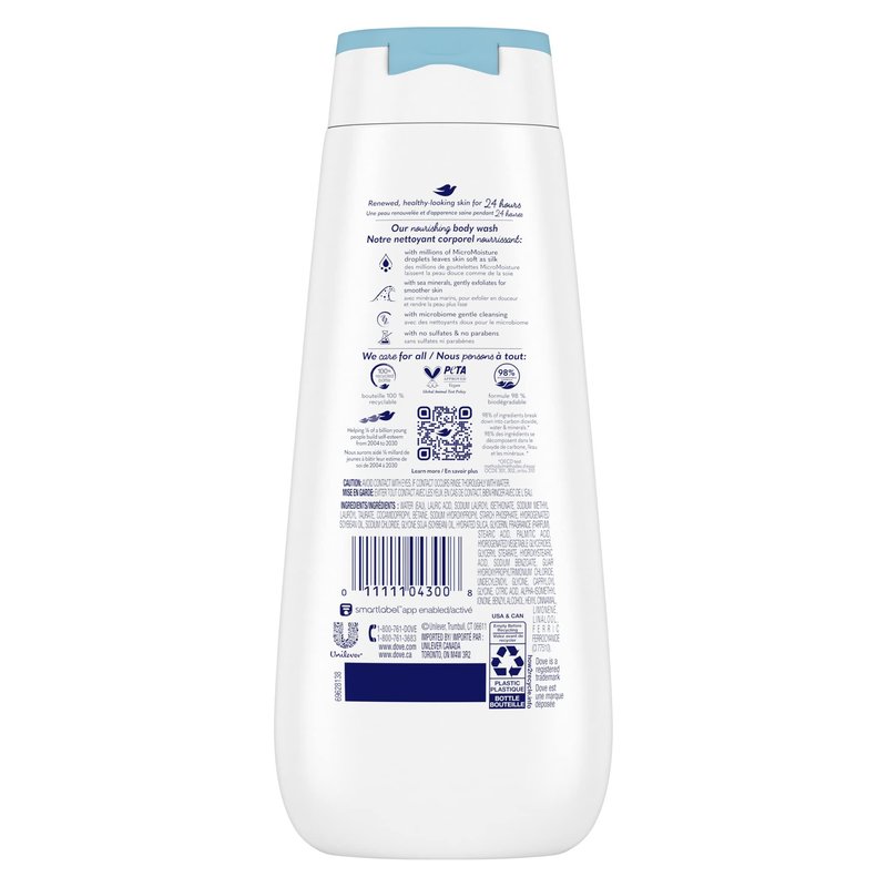 Vegan. New. No.1 dermatologist recommended. 24 hr Renewing micromoisture. Renewed, healthy-looking skin for 24 hours. Our nourishing body wash: with millions of MicroMoisture droplets leaves skin soft as silk; with sea minerals, gently exfoliates for smoother skin; with microbiome gentle cleansing; with no sulfates & no parabens. www.dove.com. www.dove.ca. how2recycle.info. Learn more. SmartLabel app enabled. Call 1-866-761-DOVE; 1-800-761-3683. Helping 1/4 of a billion young people build self-esteem from 2004 to 2030. 100% Recycled bottle. We care for all: PETA Approved. Global animal test policy. 98% Biodegradable formula. 98% of ingredients break down into carbon dioxide, water & minerals (OECD test methods 301, 302 or 310).