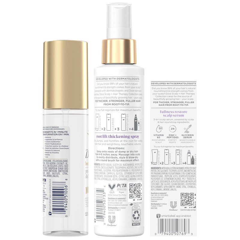 Dove Scalp+ Hair Therapy Root Lift: Get fuller-looking hair with Dove’s Root Lift spray, infused with Vitamin B3 and Zinc. This sulfate-free formula provides an instant boost of volume right from the roots. Dermatologist-formulated, the nourishing formula soothes and comforts a dry scalp.