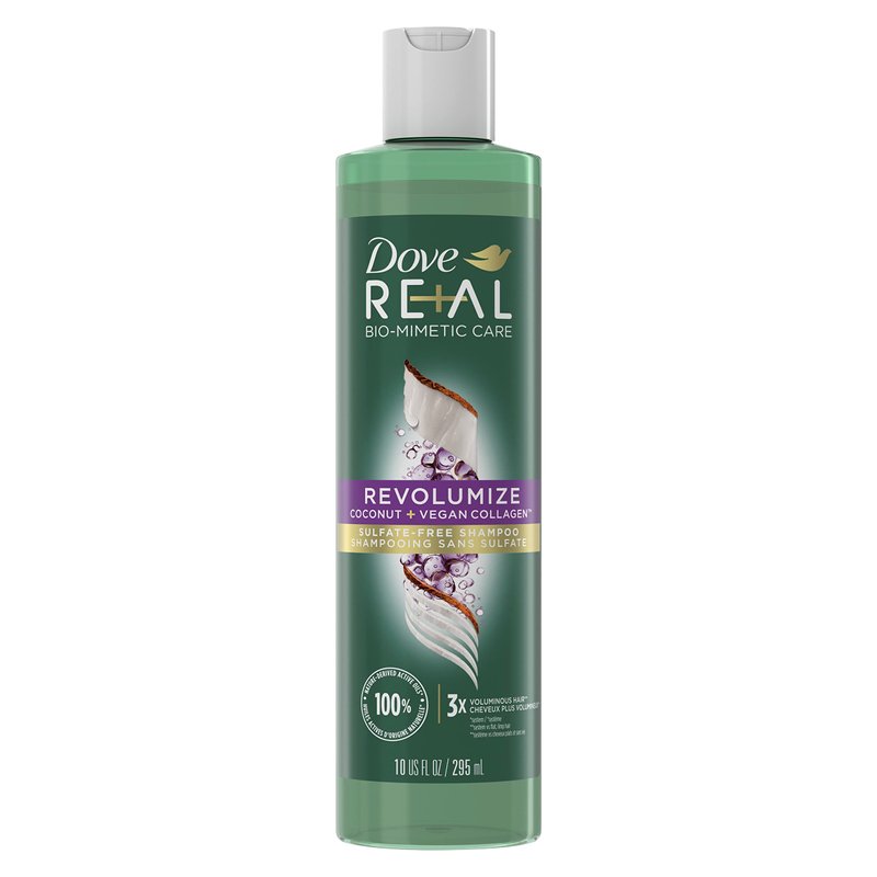 - FOR FINE, FLAT HAIR: This Dove RE+AL Bio-Mimetic Revolumize Coconut + Vegan Collagen Shampoo is specially designed for nourishing, volumizing flat and thin hair
