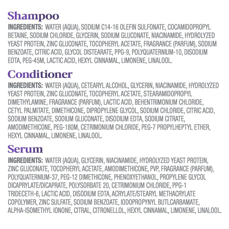 - HAIR BREAKAGE REPAIR TREATMENT: The Clarifying Shampoo cleanses scalp build up without stripping hair while the Strengthening Conditioner and Scalp Serum promote fullness and hair thickening.