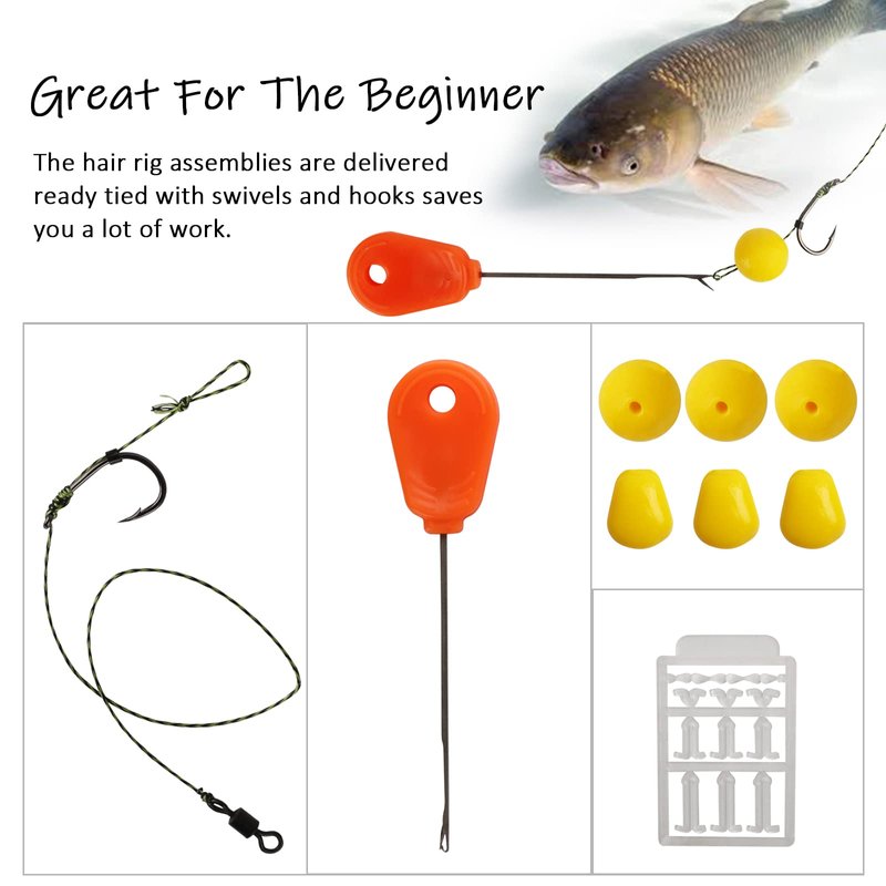 - Great For The Beginner: The hair rig assemblies are delivered ready tied with swivels and hooks saves you a lot of work.Just use the stringer needle to make the wire get through the bait, choose a suitable hair rig into the end of the wire to keep the bait slide off and the rig is done!