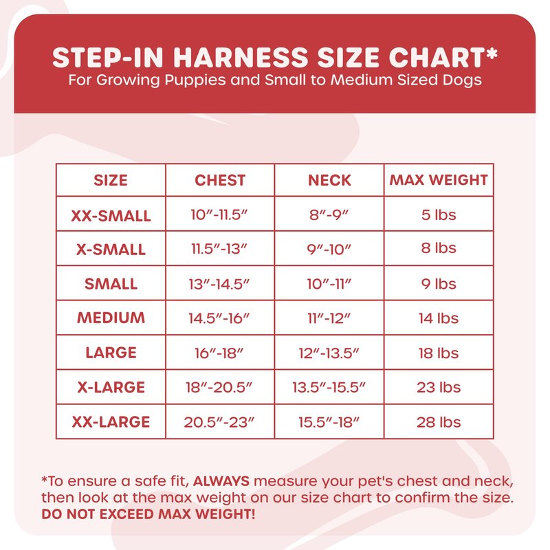 - Size Chart: Please refer to our step in harness sizing chart to make sure you select the right dog chest harness for your pet to provide a perfect fit