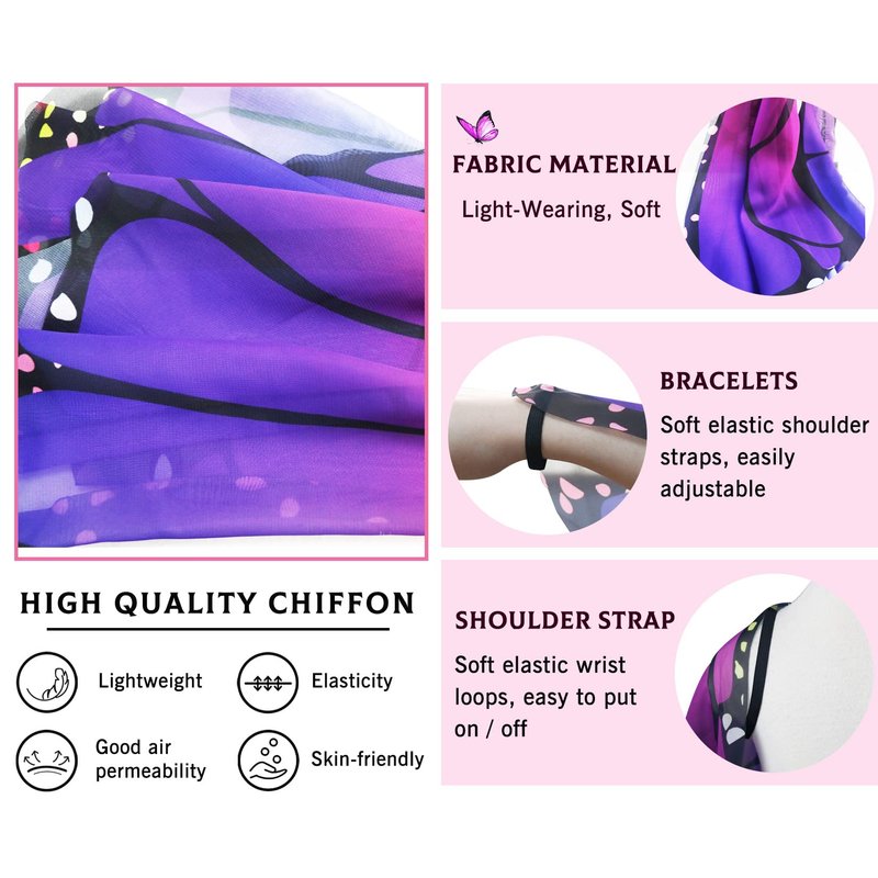 - ➤【Excellent Quality】: ★Monarch Butterfly wings for girls , made of 100% Chiffon, feathered, vibrant colors, It feels really cozy and its so light-wear so you can easily move, play and dance.; Hand wash and hang air dry.