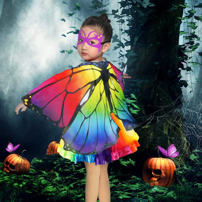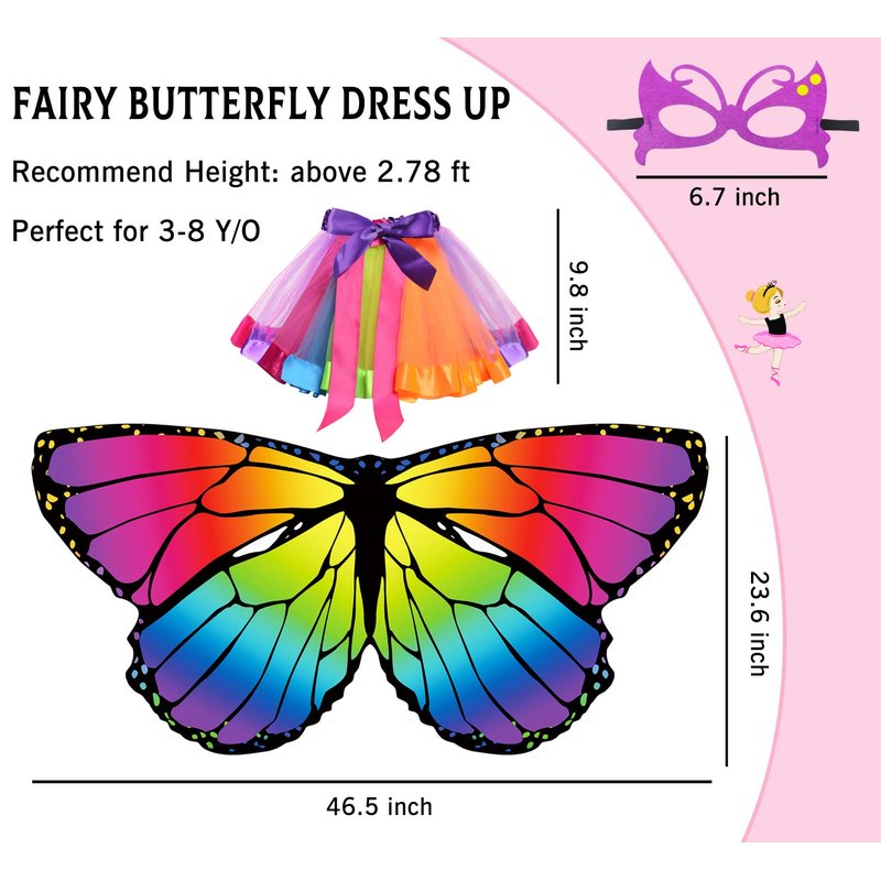- Butterfly Costume for Girls Dress-Up: Butterfly Costume for toddler girls play includes Child Butterfly Wings Cape + Rainbow Layered Tulle Tutu + Butterfly Mask; Multiple ways to dressing-up, more pleasure. Kids BUTTERFLY WINGS is approx 47.2 x 23.62 inch; Rainbow Tutu Skirt: Waist to hem length 10.6 inch. Butterfly costume set is ideal for most 3-9 years old girls.