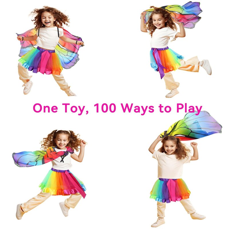 - Play Toys for Multiple Occasions: Fairy butterfly wings with Tutu Skirt, perfect for butterfly dress-up, fairy butterfly party, rainbow Halloween costume, Princess dress up trunk, Festival Rave, Masquerade, or just everyday whimsical imaginative play indoor & outdoor, dancing costumes; Fairy wings, no wires or rods and great for travel too.