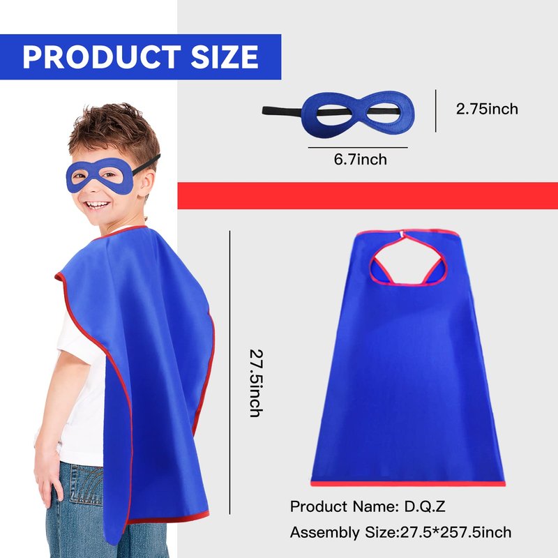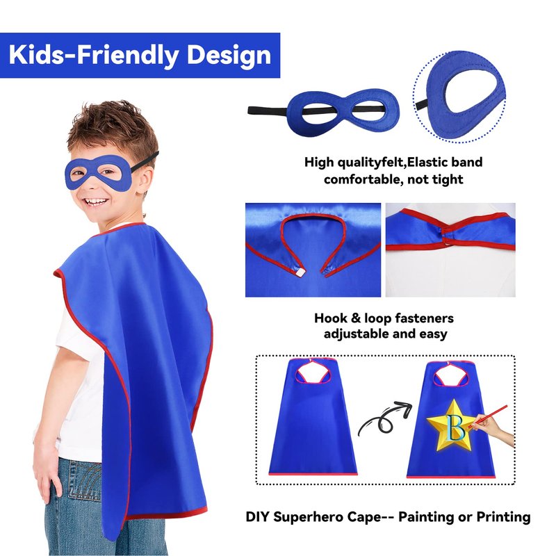 - ➤【Kids Superhero Capes and Masks Sets】 - Kids Superhero Capes, 27.5”x 27.5”, great superhero toys for Most 3-9 years old boys girls dress up, children can have hours of fun with SUPER HERO pretend play capes.