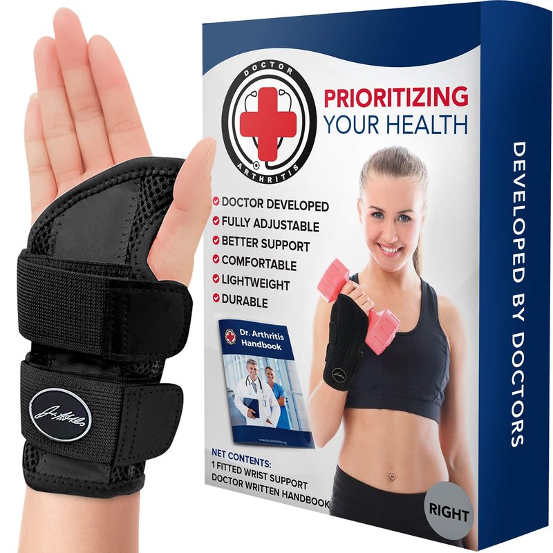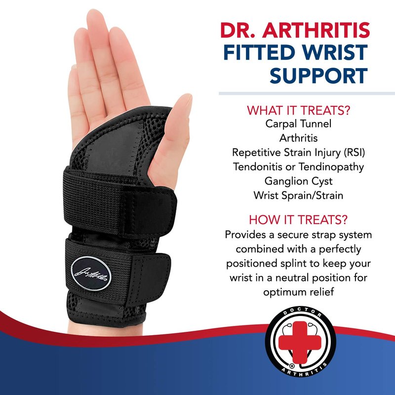 Dr. Arthritis Doctor Developed Fitted Wrist Brace for Carpal Tunnel Syndrome, Tendonitis and other Wrist Conditions, Splint Support for Men and Women Single (Black, Right Hand)