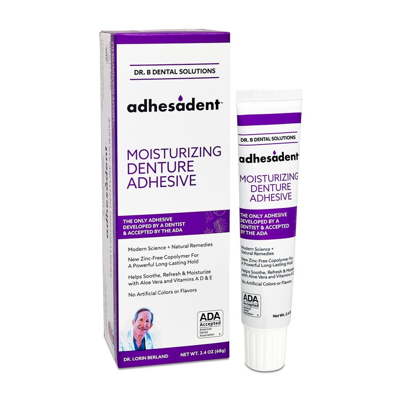 Dr. B Dental Solutions Adhesadent Moisturizing Denture Adhesive - Secure Denture Glue with Strong Grip & Natural Taste - Zinc-Free Dental Adhesive for Dentures, Overdentures - 2.4 oz