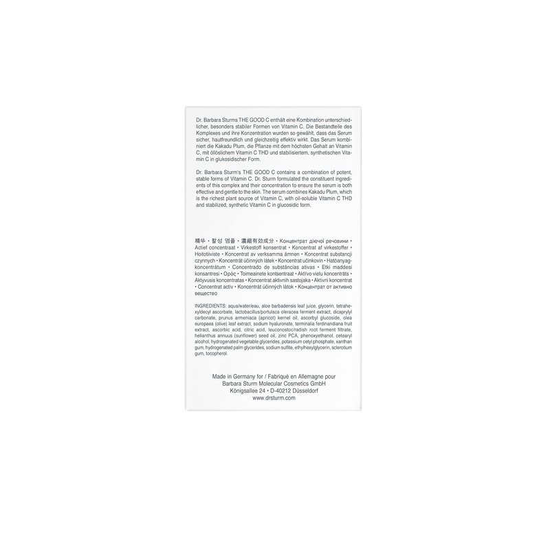 Dr. Barbara Sturm’s the good c vitamin c serum deploys her proprietary formulation of vitamin C in three skin-friendly forms. The serum contains the optimal concentration of 5% Vitamin C in a stable form that is easily absorbed, safe and gentle on the skin. THE GOOD C VITAMIN C SERUM has an active ingredient complex that includes oil-soluble Vitamin C THD and stabilized, synthetic Vitamin C in glucosidic form. Together, they help to reduce uneven pigmentation, improve tone and provide anti-oxidative protection from free radicals and environmental stressors for a youthful and healthy-looking complexion. The serum also contains Zinc, which helps to increase the absorption of Vitamin C into the skin. Finally, Vitamin C supports the formation of collagen, which is needed for firm and youthful-looking skin.
