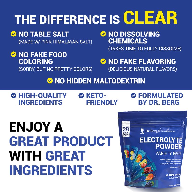 - π§π₯π¨π¦π§ππ ππ¬ π ππ‘π¬ - Dr. Berg has cultivated millions of followers across multiple social media platforms by providing educational health content and easy to follow natural remedies to everyday health problems. His knowledge of the body and what it needs is extensive and translates to his high-quality products like these sugar free hydration packets for water. His care for ingredients is what separates Dr. Berg's products from others.