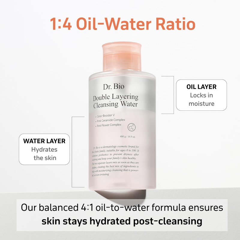 Discover the ultimate blend of science and Korean beauty with Dr. Bio's Double Layering Cleansing Water—a groundbreaking solution that unites water cleanser with nourishing elements for unparalleled skin care. Our patented formula is rich in Cica Lactobacillus Plantarum, a revolutionary second-generation ingredient discovered by Dr. Bio. This potent element enhances your skin's natural strength while balancing moisture levels. Imagine a face cleanser that does more than just clear away makeup; it revitalizes, hydrates, and strengthens your skin with every use.