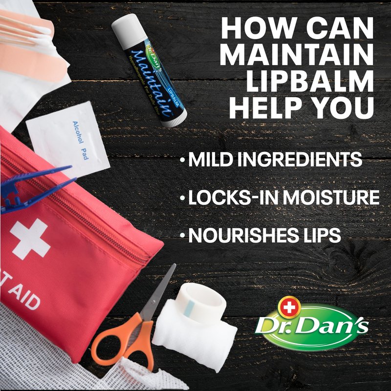 - Gentle on Delicate Skin: Dr. Dan's Maintain Lip Balm contains only the finest pure ingredients. Our ingredient list is concise: Petrolatum, Mineral Oil, Beeswax, and Vitamin E. Dr. Dan's Maintain goes beyond the ordinary Vitamin E stick or beeswax lip balm, soothing and rejuvenating your skin to provide you with healthy, soft lips. Because it contains no harsh substances or oils, Maintain is also an excellent choice for a children's lip balm.